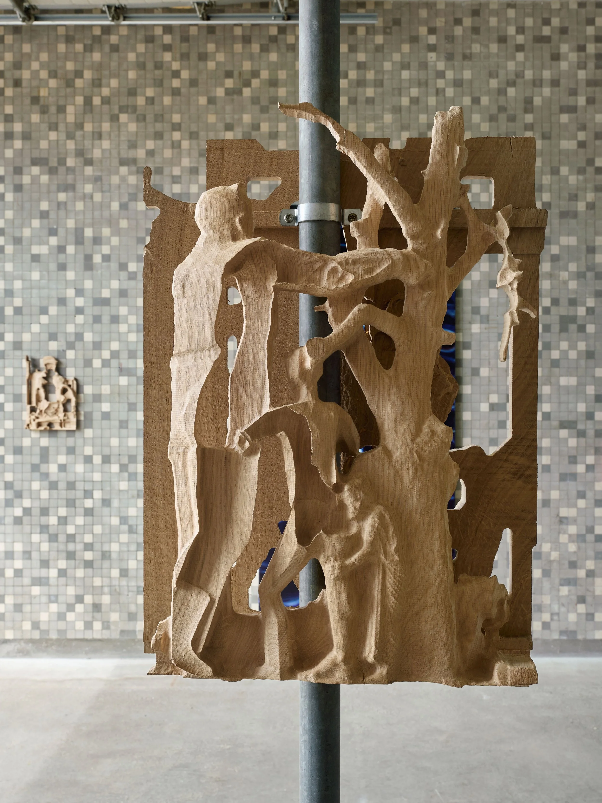 The works reflect on a present where visual and media cultures merge into endless streams of images, and where meanings are continually reconstructed and distorted – not least in an era shaped by AI-generated imagery. Wood, as a material, anchors the works in a physical and historical dimension, recalling the transformation of image forms during the Reformation, when ecclesiastical reliefs were reworked to serve new ideological purposes. The reliefs explore the image’s capacity to mutate, perform, and assume new functions across shifting contexts.